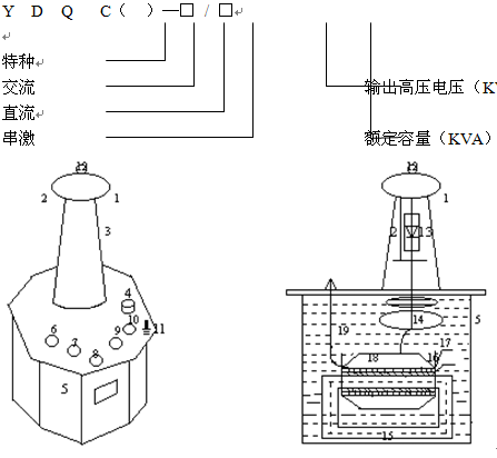 1-均压球;2-硅堆短路杆;3-高压套管;4-油阀;5-壳体;6、7-调整电压输入a、x端子;8、9-仪表测量E、F端子;10-高压尾X端子;11-变压器外壳接地端;12-高压输出A端子;13-高压整流硅堆;14-内部均压环;15-变压器铁芯;16-初级低压绕组;17-测量仪表绕组;18-二次级高压绕组;19-变压器油。